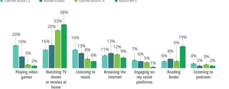 Compared to six months ago, consumers across generations have been spending more time watching TV and browsing the internet, but Millennials and Generation Z (Gen Z) continue to show differences in adoption and use of digital entertainment. Nineteen months into the pandemic and Boomers and Generation X (Gen X) still rank watching TV shows or movies at home as their favorite entertainment activity. (Since around 63% subscribe to a pay TV service, we suspect that for many, “watching TV” now includes SVOD.) (Figure 2.) Gen Z, meanwhile, still ranks playing video games as their preferred form of entertainment. And everyone younger than Boomers, especially Gen Zs and Millennials, has been listening to music more than they were six months ago.